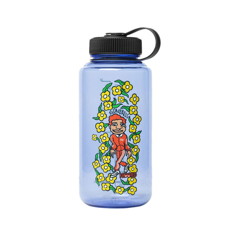 Conçue en collaboration avec le légendaire Mark Gonzales, cette gourde en plastique durable arbore une illustration exclusive du "Gonz" entouré de fleurs colorées, dans un esprit fun et créatif typique de Krooked Skateboards.