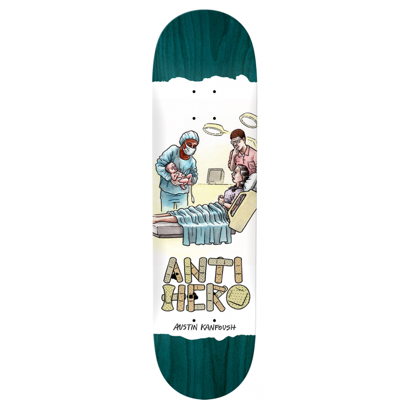 Plateau skateboard de la marque Antihero, série Medecine, sérigraphie sous le dessous de la planche dessiné par Todd Francis, Austin KANFOUSH signature.