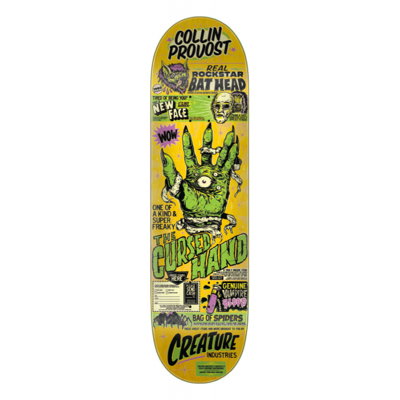 Planche skate de la marque Creature, sérigraphie sous le plateau, Collin PROVOST signature.