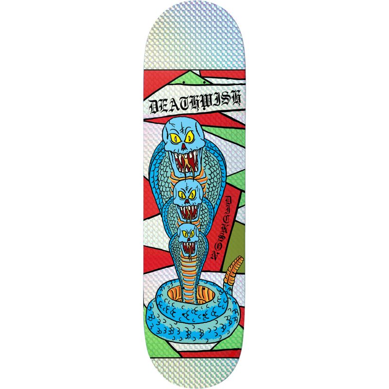 Plateau skateboard de la marque Deathwish, sérigraphie sous la planche, modèle Cobra la la la, Jon DICKSON signature.