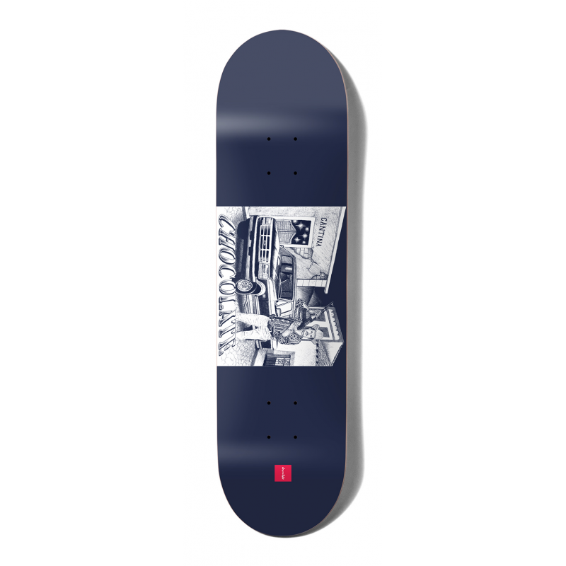 Planche de skate de la marque Chocolate, sérigraphie sous le plateau, Modèle Cantina, Erik HERRERA signature.