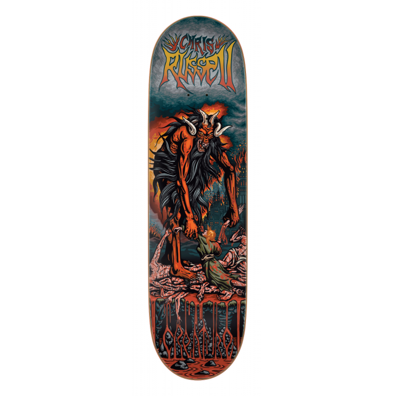 Planche skate de la marque Creature, illustration sous la planche, Chris RUSSELL signature.