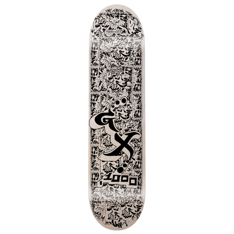 Planche de skate de la marque GX 1000, illustration sous le plateau réalisée par l'artiste SAVIE, Jeff CARLYLE signature.