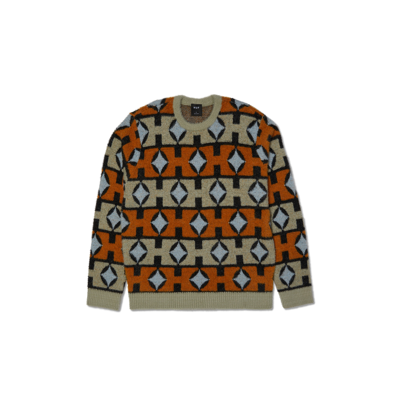 Le Space Age Crewneck Sweater de HUF revisite le pull à rayures avec une texture mohair premium. Composé de 65 % nylon, 22 % rayonne et 13 % coton (7G), il affiche un motif jacquard rayé sur l'ensemble, avec finitions en maille côtelée 1x1 et étiquette HUF tissée. Un style vintage-futuriste pour affronter la saison avec audace.
