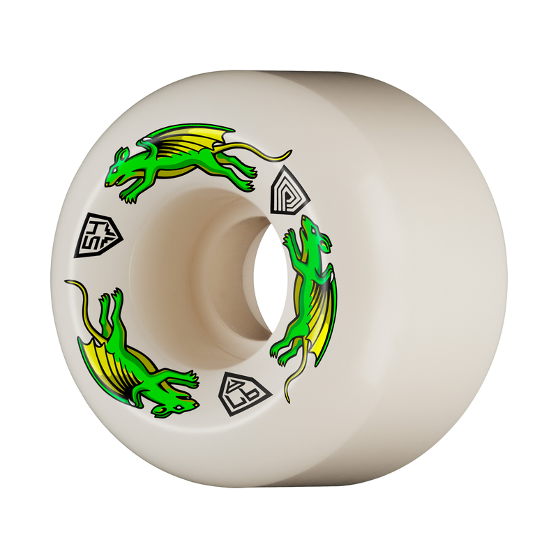 Roues pour skateboard de la marque Powell Peralta, modèle Dragon Rat, illustration sur le côte de la roue