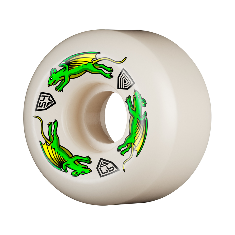 Roues pour skateboard de la marque Powell Peralta, modèle Dragon Rat, illustration sur le côte de la roue