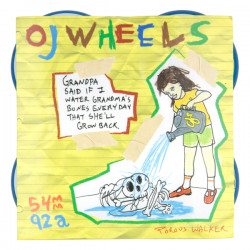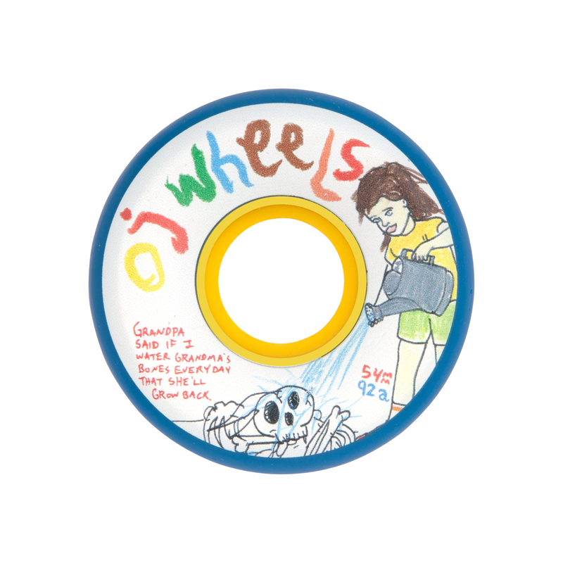 Roues pour skateboard de la marque OJ WHEELS, illustration réalisée par l'artiste Porous Walker, elle est imprimée sur le côté de la roue.