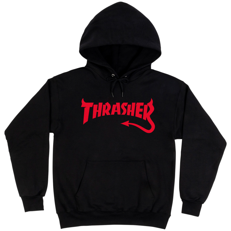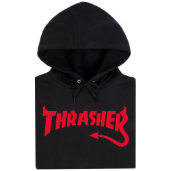 Sweat à capuche et poche centrale de la marque Thrasher, imprimé sur la poitrine.