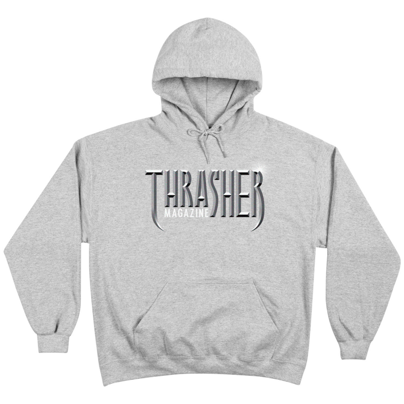 Sweat à capuche et poche centrale de la marque Thrasher, imprimé sur la poitrine.