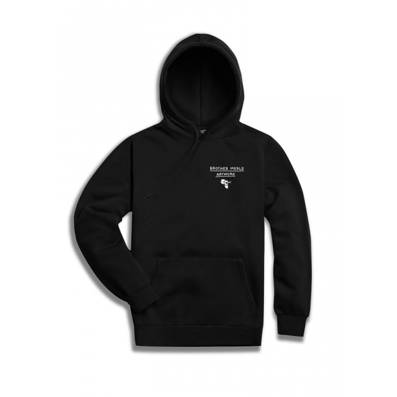 Sweat à capuche et poche centrale de la marque Brother Merle, illustration imprimée devant et dans le dos du vêtement.