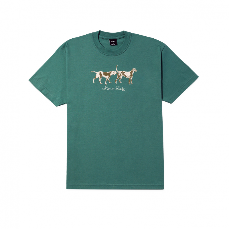 T-shirt à col rond et manches courtes de la marque HUF, logo imprimé sur le devant du vêtement.