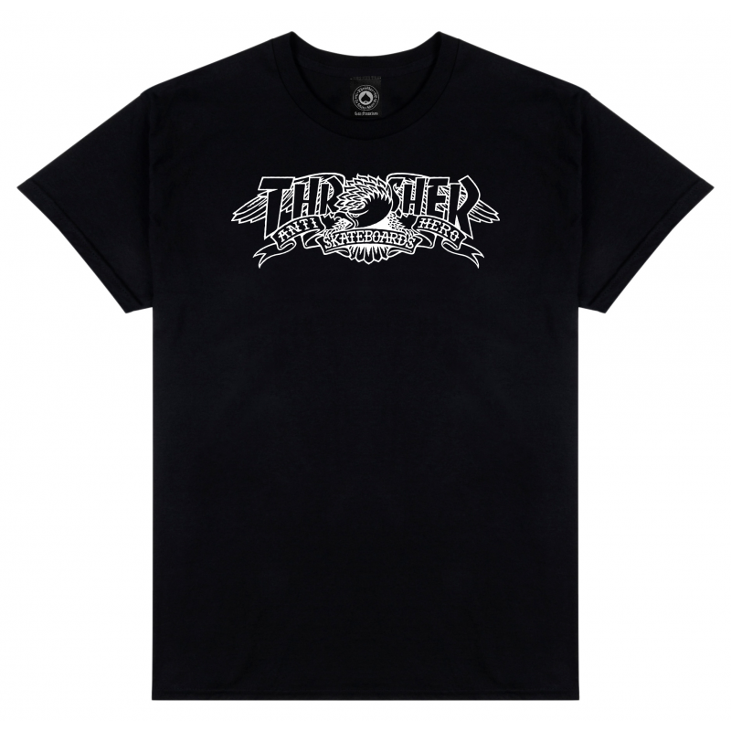 T-shirt à col rond et manches courtes de la marque Thrasher en collaboration avec Antihero, illustration imprimée devant.